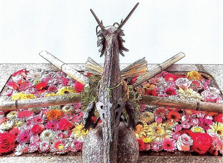 龍は、水をつかさどる神様として崇められる。その龍の口から流れる水をたたえた水盤には、色とりどりの花々が浮かぶ。この心温まる花手水の他にも、反対側にある手水石などに期間限定で花が飾られている。