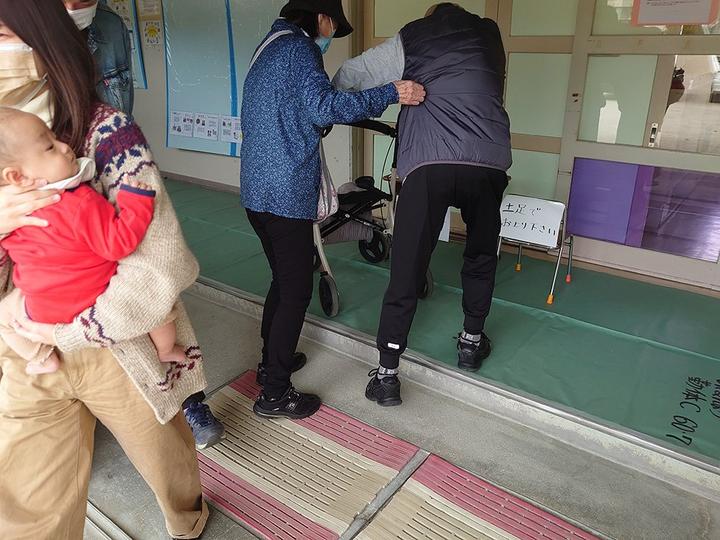 ◎そんな折、24日の投票日にこの投票所の段差で苦労している高齢者を見かけた。段差のため男性の手押し車が上がらず、妻らしき女性も手押し車を引き上げられないでいた。