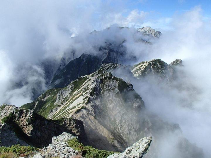 唐松岳から白馬方向:ガスの隙間から「不帰の嶮」と呼ばれる荒々しい岩稜が見え隠れする