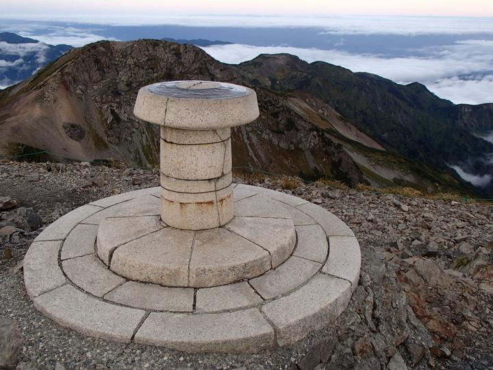 ところで、ここ白馬岳の山頂に鎮座する石造りの風景指示板にまつわる話は、新田次郎の小説「強力(ごうりき)伝」であまりにも有名で、昔からの山好きな人にとっては山頂に立つことよりも、これを一目見たいというのが目的になる。この小説の中身については端折るが、主人公の小宮正作が花崗岩でできたこの風景指示板の一部、重量50貫(187キロ)を担ぎ上げたというものだ。