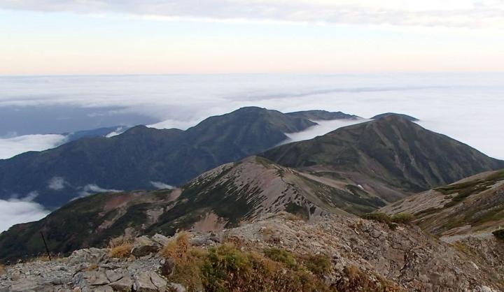 山頂からは360度さえぎるものがない。中腹以下は雲海の下で、言い換えれば俗世を覆い隠しての大展望だ。長い間ずっと思い描いていた遠くに続く山並みが現実に目の前にある。感動とか感激といった心が躍る心境ではなく、どちらかといえば「納得」とか「合点」したというものかもしれない。