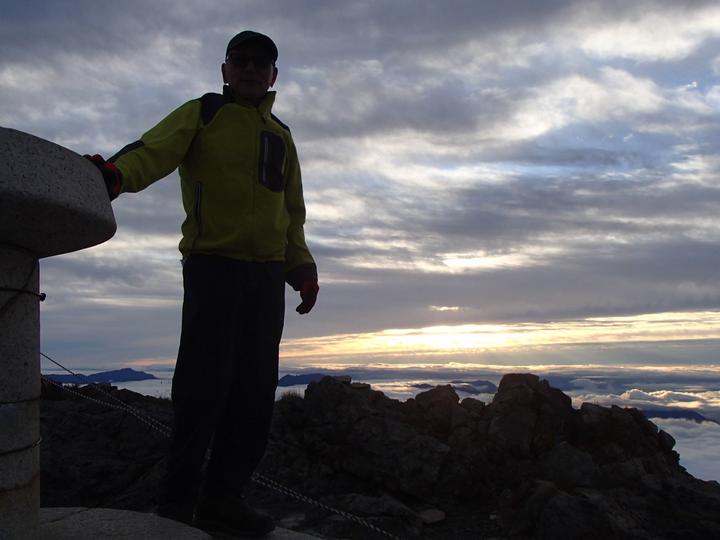 こうして夜明け前からでも容易に歩けるのは、山頂直下に立派な山小屋やキャンプ指定地があるからでもあるし、何より天気が良い。昨日が嘘のような穏やかな朝だ。風もなく雲海の先から昇る朝日を拝めることはラッキーとしか言いようがない。