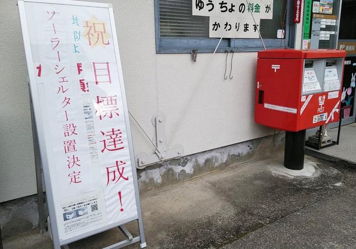 目標達成に須金中が喜んだ:郵便局の前には「祝!目標達成」の看板が立った