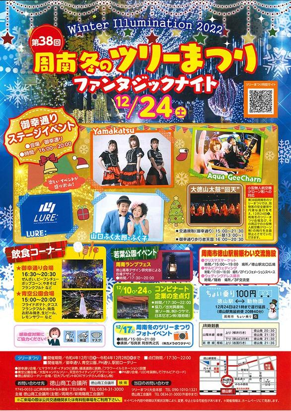 山口県周南市の第38回周南冬のツリーまつりは24日(土)午後4時から8時半まで、3年ぶりに御幸通を歩行者天国にしてステージや、市民団体の店と露店もたくさん出るファンタジックナイトが開かれる。