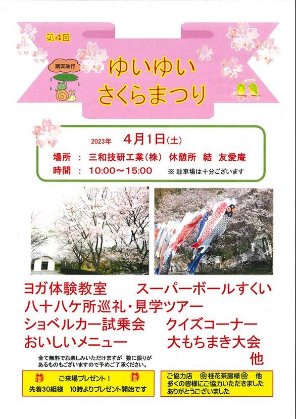 山口県光市小周防の三和技研工業㈱(三條佳恵社長)で4月1日(土)午前10時から午後3時まで、第4回ゆいゆいさくらまつりが開かれる。