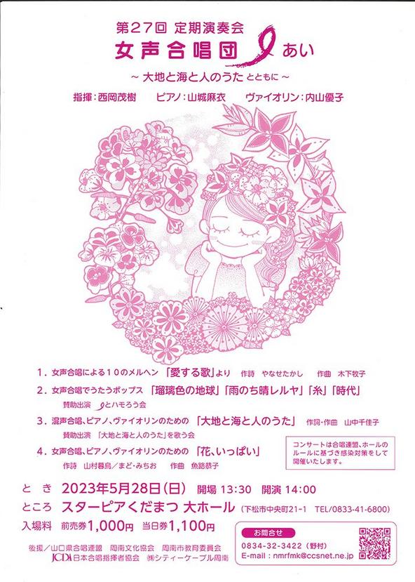 女声合唱団Ⅰ(あい)(野村文子代表)の第27回定期演奏会「大地と海と人のうたとともに」が28日(日)午後2時から下松市のスターピアくだまつ大ホールで開かれる。