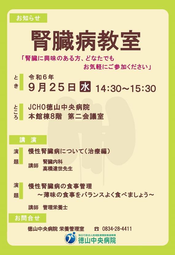 周南市孝田町のJCHO徳山中央病院の8階第二会議室で、9月25日(水)午後2時半から3時半まで腎臓病教室が開かれる。