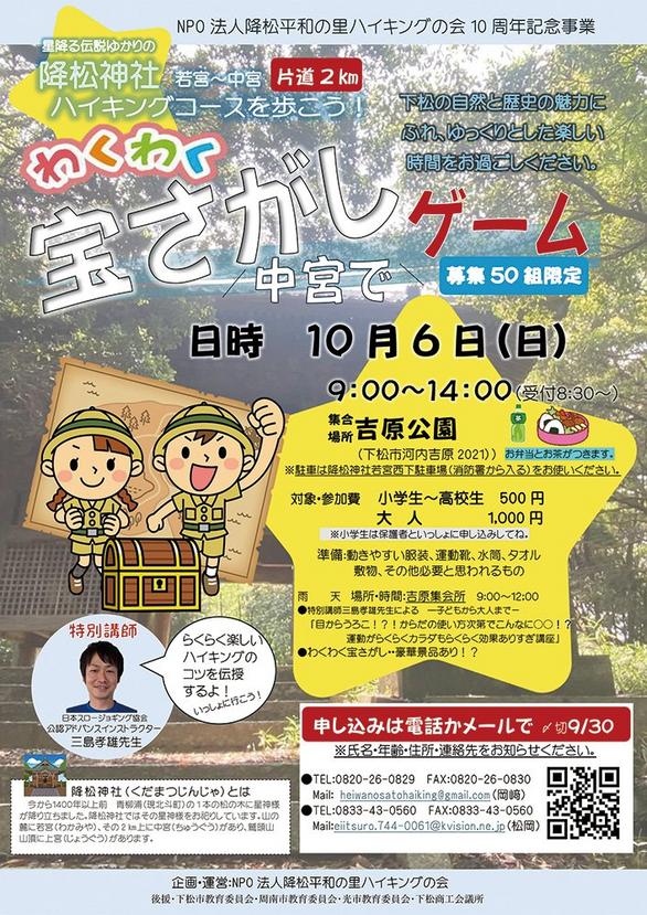 下松市のNPO法人降松平和の里ハイキングの会(永田憲男理事長)の「スローハイキング大会 in 中宮2024」(新周南新聞社など後援)が10月6日(日)午前9時に開かれ、同市河内の吉原児童遊園に集合して、降松神社の中宮周辺で約2キロのハイキングを楽しむ。