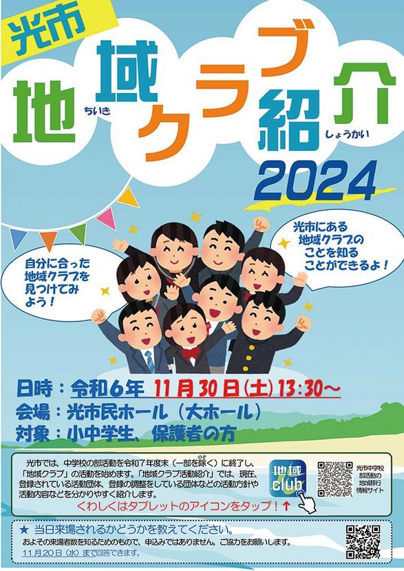 光市教委は30日(土)、中学生の受け皿となる地域クラブ団体の活動内容を紹介する「光市地域クラブ紹介2024」を光市民ホール大ホールで開く。