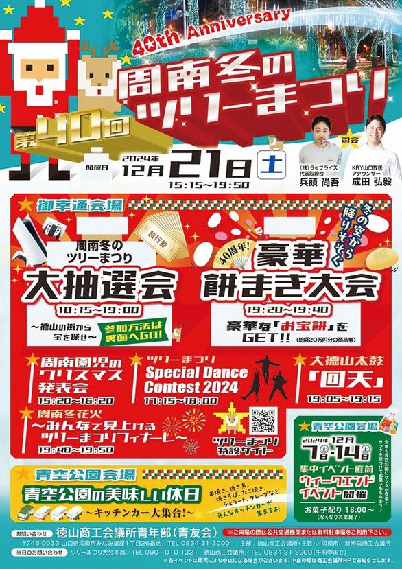 周南冬のツリーまつり徳山商工会議所、市、新南陽商工会議所が主催して、1月5日(日)まで開かれている。問い合わせは徳山商議所(0834-31-3000)へ。