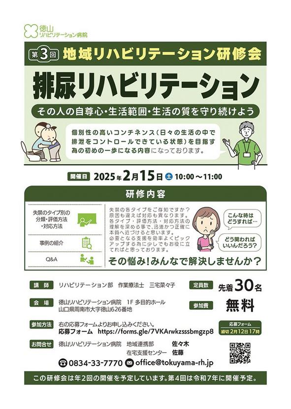 周南市徳山の医療法人生和会徳山リハビリテーション病院は同病院1Fの多目的ホールで2月15日(土)午前10時から11時まで、介護などの専門職向け研修会「排尿リハビリテーション〜その人の自尊心・生活範囲・生活の質を守り続けよう〜」を開く。