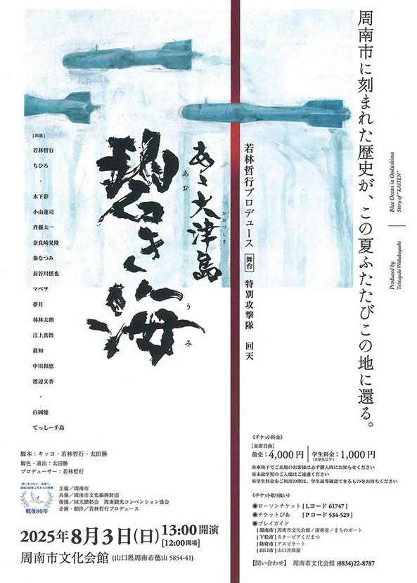 太平洋戦争末期、周南市の大津島に特攻兵器「回天」の訓練基地があった。この歴史を語り継ぐ演劇「あゝ大津島 碧き海」が8月3日(日)午後1時から市文化会館大ホールで上演される。5月30日からチケットの販売が始まった。