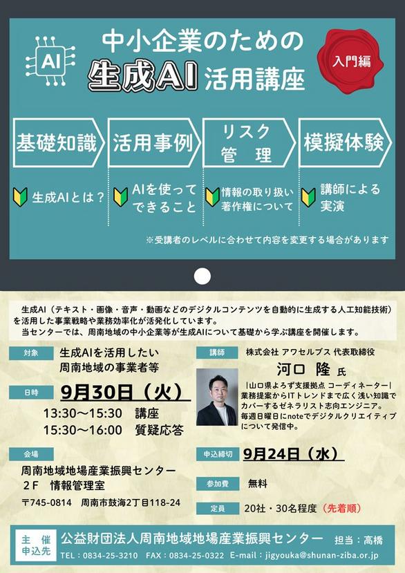 参加対象となるのは生成AIを活用したい周南地域(周南市、下松市、光市、田布施町)の事業者。申し込み締め切りは9月24日(水)。先着順。