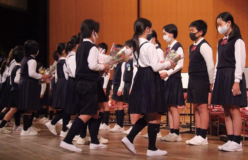花束を受け取る6年生団員(奥)