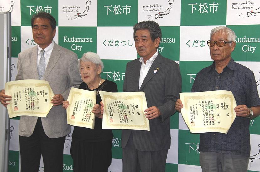 高齢者の文化と芸術の祭典、ねんりんピック山口2019(県健康福祉祭)美術展で下松市からの入賞者の表彰式が6日、市役所で開かれ、村岡知事名の賞状を国井市長が3人...