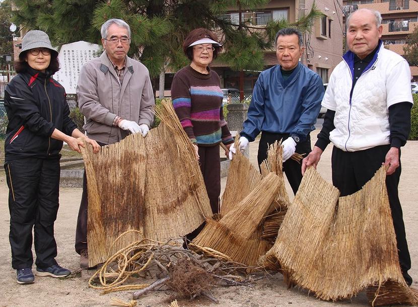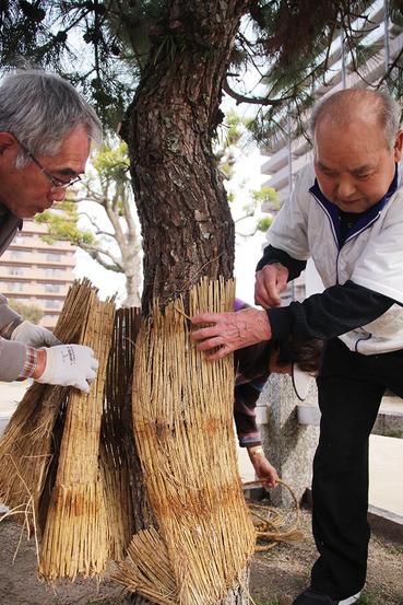 下松市北斗町の金輪神社(神足正己宮司)の“鼎の松”に昨年11月に巻いたわら製の“こも〟が13日に外された。作業には毎年、近くの下松小から4、5年生が参加してい...
