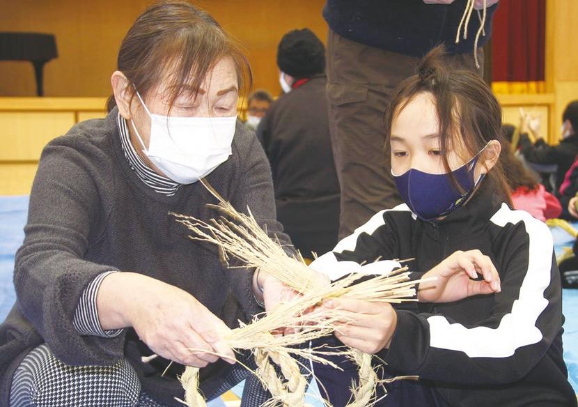 住民の指導でわらをなう児童