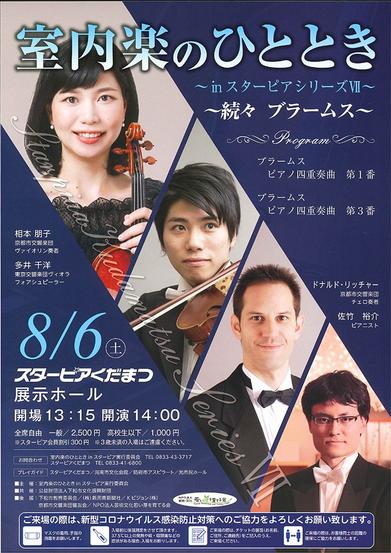 山口県下松市出身のバイオリン奏者で京都市交響楽団員の相本朋子さん(36)ら4人が演奏する“室内楽のひとときinスターピアシリーズⅦ〜続々ブラームス”(新周南新...