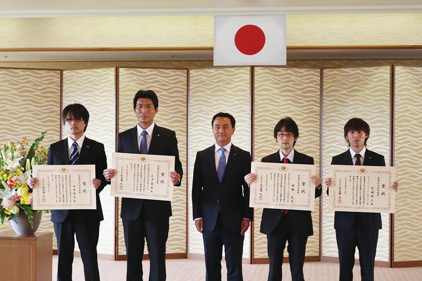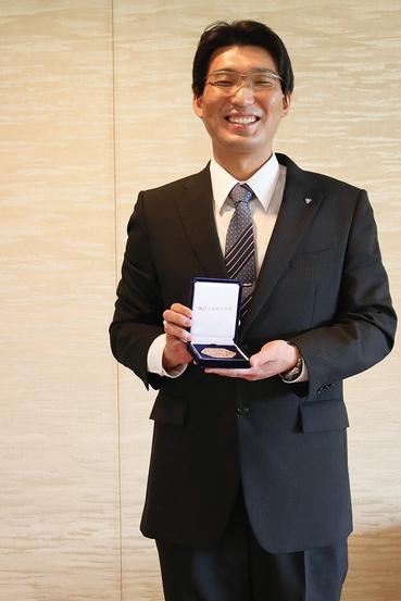 文化その他文部科学大臣表彰の「創意工夫功労者賞」の受賞者が決まり、周南では周南市の㈱トクヤマ徳山製造所の設備管理グループ、三戸昌憲さん(33)が受賞した。これは、職場で科学技術の進歩、改良に役立つ実績をあげた人を表彰する制度。今回は県内から4人が受賞し、14日に県庁で伝達式が開かれ、村岡嗣政知事からメダルが伝達された。
