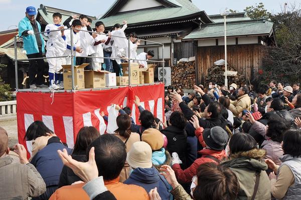 周南市遠石の遠石八幡宮(黒神直大宮司)で3日、節分祭が開かれ、豆まき神事では境内の特設舞台から年男、年女22人と総代2人が豆や餅などの入った約8,000袋を集...