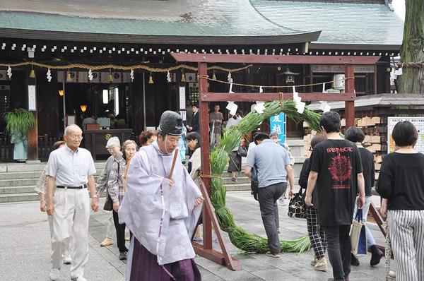 周南市の遠石八幡宮(黒神直大宮司)で6月30日、夏越の大祓式があり、約80人が神事のあと境内に置かれたけがれを払うとされるカヤ製の茅の輪をくぐり、夏を健康に過...