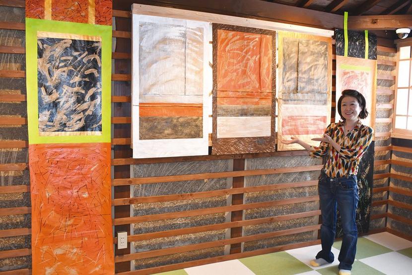 今回の展覧会名の「autunno」はイタリア語で秋。鹿野の自然をテーマにした作品は、米の紙袋にアクリル、水彩絵の具、クレヨン、墨汁、ろう、整髪剤も使って描いた抽象画。掛け軸を意識した想定の作品など20点が並ぶ。
