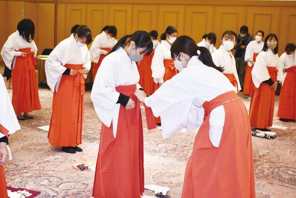 感染対策や白衣、緋袴も 遠石八幡宮で巫女の研修