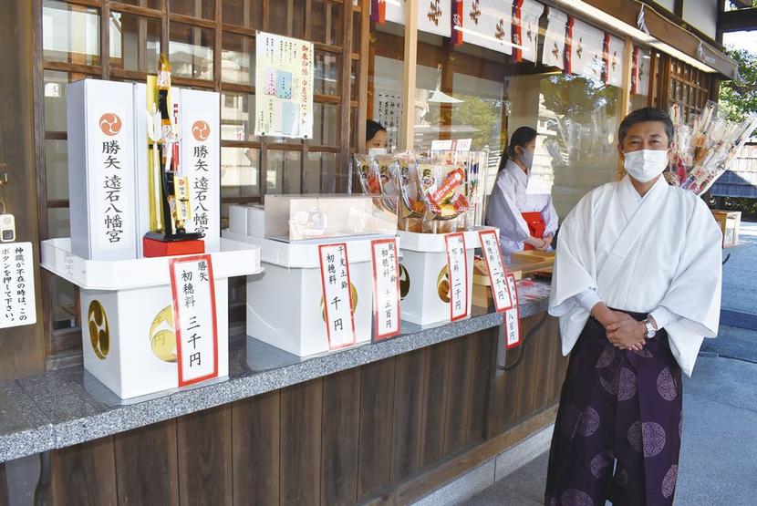 周南市の遠石八幡宮(黒神直大宮司)で16日から新年の御札、御守りと、破魔矢や福箕(ふくみ)、熊手、土鈴など縁起物の授与が始まった。同八幡宮では早めに縁起物を授...
