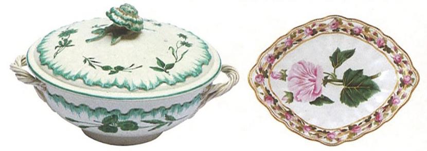 Photo Michael Whiteway (左)ウェッジウッド蓋付き皿(クイーンズウェア) 1765ー1770年頃 クリームウェア(陶器)、エナメル彩色 Photo Brain Trust Inc. (右)ダービー ボタニカル・サービスよりハナアオイ(アオイ科)1795年頃 磁器