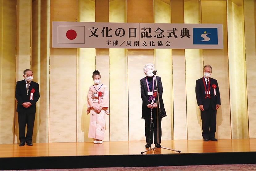 文化周南市周南市の周南文化協会(西崎博史会長)の文化の日記念式典が3日、遠石会館で開かれ、文化特別功労賞を同市出身の俳人の宇多喜代子さん▽文化功労賞を能楽の吉本健一さん▽文化振興賞を邦楽の山根一枝さん(雅号・歌枝能)と周南漢詩会(木村虚舟会長、10人)に贈った。