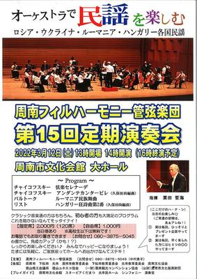 山口県周南市の周南フィルハーモニー管弦楽団の第15回定期演奏会が12日(土)午後2時から周南市文化会館大ホールで開かれる。 今回は、チャイコフスキーの弦楽セ...