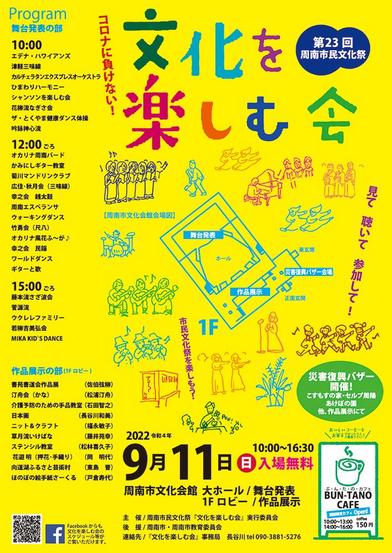 山口県周南市の市文化会館で11日(日)午前10時から午後4時半まで、踊り、楽器演奏、作品展示など35の作家や団体が出演・出展する「第23回周南市民文化祭 文化...