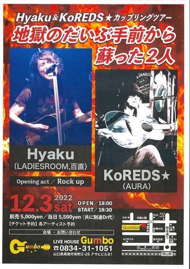 パンクバンド、レディスルームのボーカルHyakuさんとビジュアル系バンドのさきがけ、AURAのドラムスのKoREDS☆さんによる全国ツアーライブ「地獄のだいぶ...