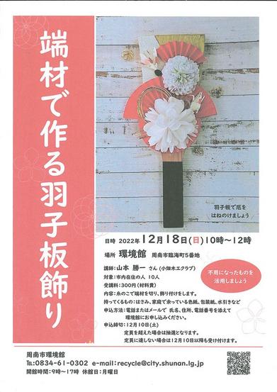 不用になったものを活用した「端材で作る羽子板飾り」が18日(日)午前10時から正午まで、山口県周南市臨海町の環境館で開かれる。 講師は同市の小畑木工クラブの...