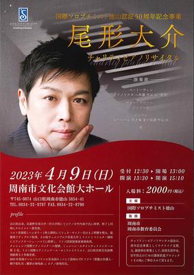 山口県周南市の国際ソロプチミスト徳山(小野浩子会長)は4月9日(日)午後1時半から市文化会館大ホールで、尾形大介チャリティピアノリサイタルを開く。 国際ソロ...