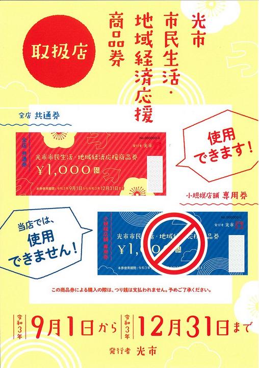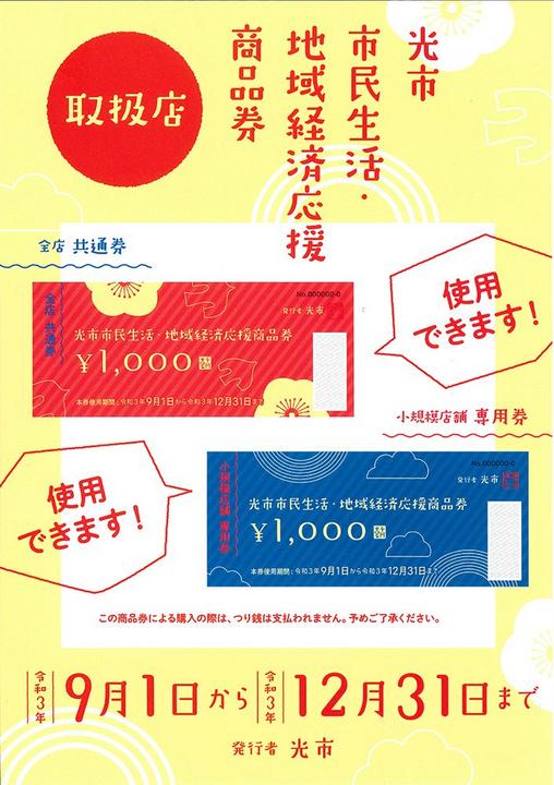 経済光市光市が市民全員に無償で支給した1人5千円分の「市民生活・地域経済応援商品券」の使用が1日から市内329店舗で始まった。使用期限は12月31日(金)まで。