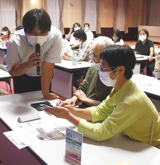 このたびのアプリ導入により、スマートフォンもカード同様に使える。説明会では同会の足立基樹さんが店側にとって必要な一連の手順を説明した。