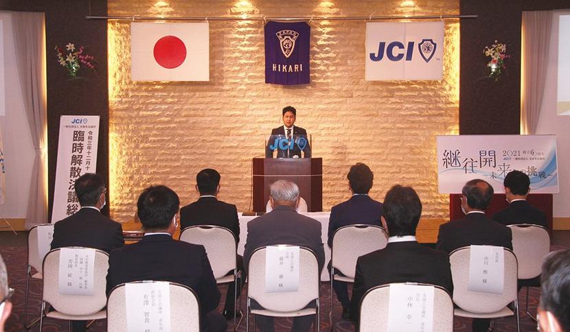 臨時解散決議総会には会員8人全員と歴代理事長や来賓など約50人が出席。第60代の和田理事長(32)は「残された会員の成長を考え、解散してさらに大きな舞台で活動する道を決断した。周南JCに移っても光JC60年の歩みを胸にJC活動にまい進したい」とあいさつした。