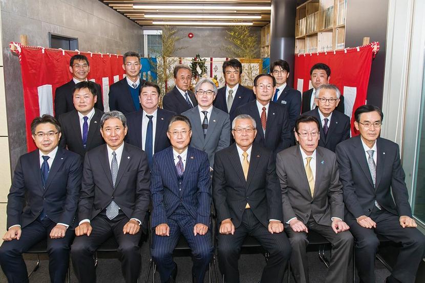 光井社長(前列左から3人目)ら竣工式に参加した人たち=巽設計コンサルタント(光市光ケ丘)