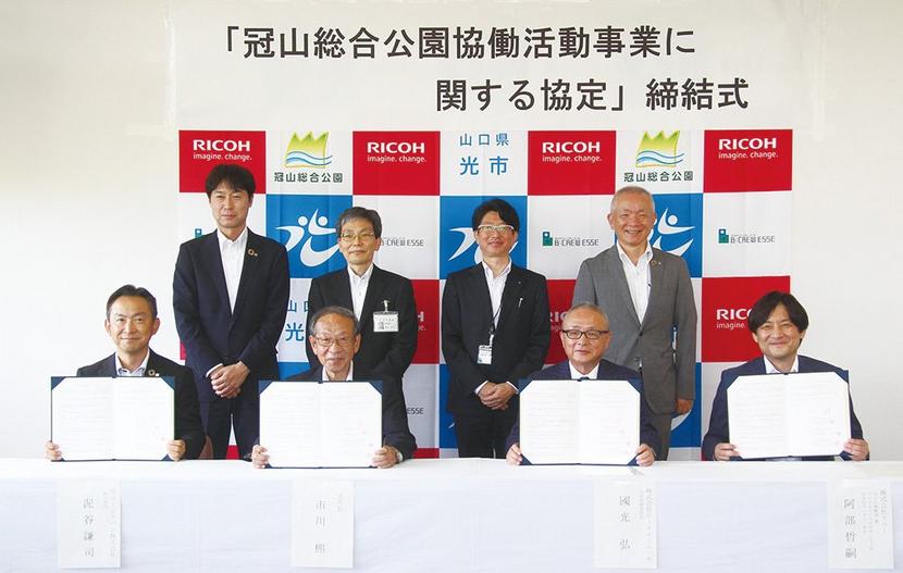 リコー、リコージャパン、ビークルーエッセ 山口県光市の冠山総合公園と隣接の市有地の山林の環境美化活動を市と協働して進める協定が23日、リコー(山下良則社長、本...