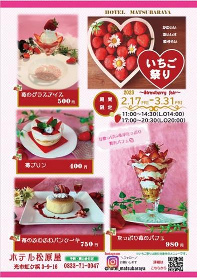 山口県光市虹ケ浜のホテル松原屋のレストラン LesPier が31日(金)までイチゴのデザートが楽しめる「いちご祭り」を開催し、人気を集めている。 メニュー...