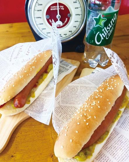 パリッとジューシーなウインナーソーセージを挟んだイレブンマリンドッグ(250円)はハインツのケチャップとマスタードをお好みで好きな量かける。