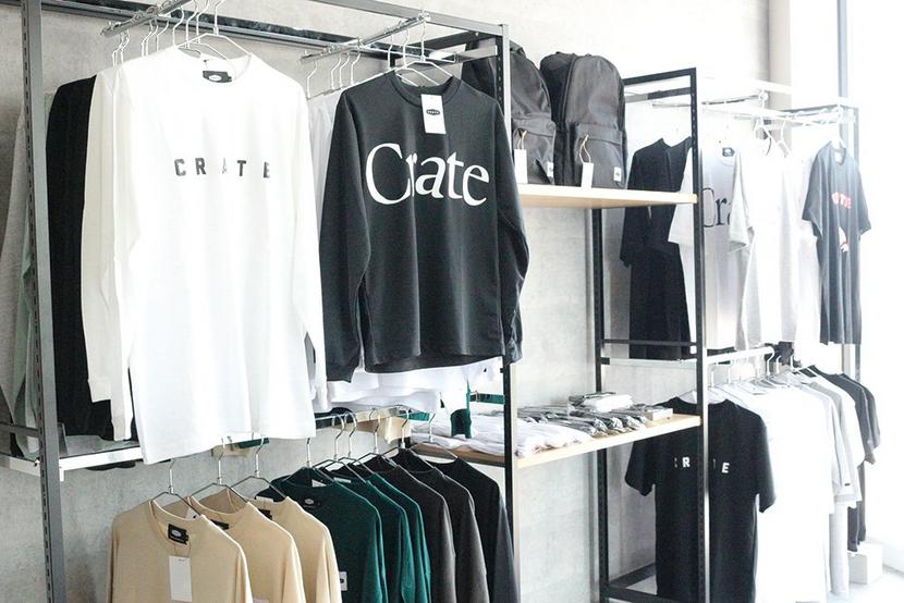 林オーナーがおすすめするブランドは福岡県で制作されているCRATE(5,000円〜)。シンプルだがロゴが大きくデザインされていて存在感があるので、おしゃれ着にもぴったり。