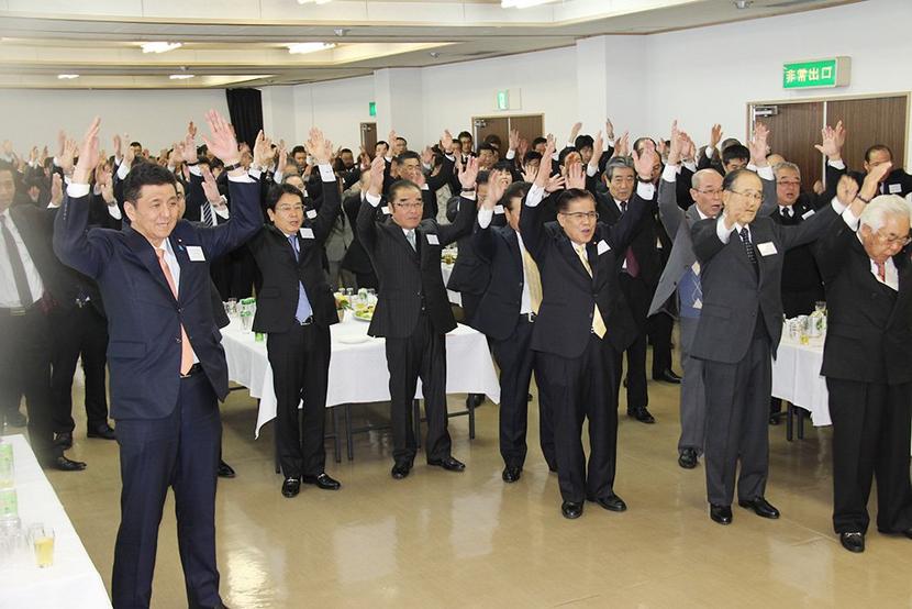乾杯する弘中会頭(右手前)ら