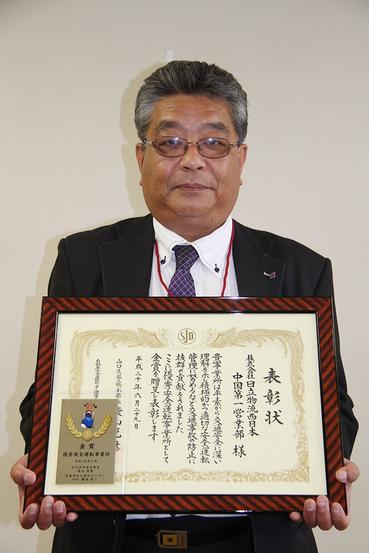 職場ぐるみで安全運転や交通事故防止に努めた“優秀安全運転事業所”の金賞を下松市東海岸通りの日立物流西日本中国第一営業部(井手本真部長)が受賞し、6月29日、下...