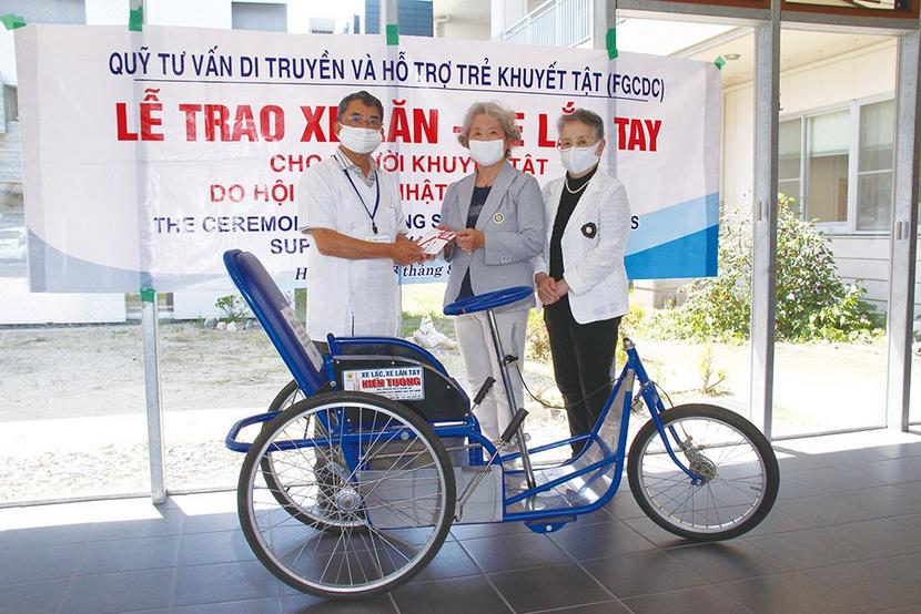 ベトナム製車椅子と左から岩本理事長、後会長、森繁委員長(IMAYA)