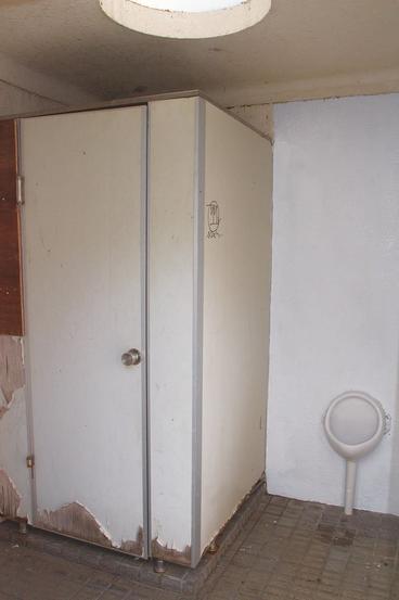 しかし長年の風雨でサイコロの赤い丸はほとんど消え、大便器の扉が痛むなど使い勝手が悪くなっていた。