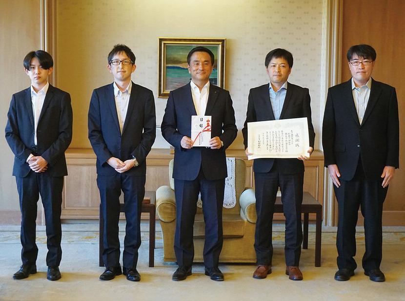 左から河野会長、佐伯会長、村岡知事、石見会長、玉本会長
