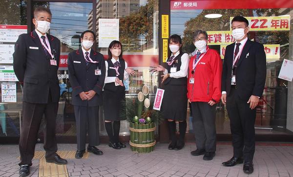 下松郵便局に手づくり門松 2か月早く新春気分 年賀はがきの販売PRも