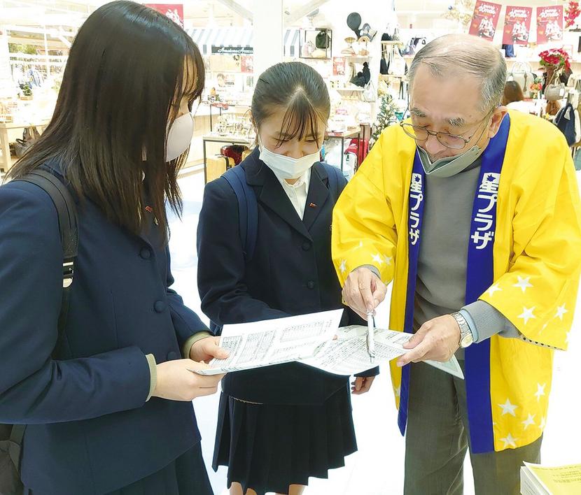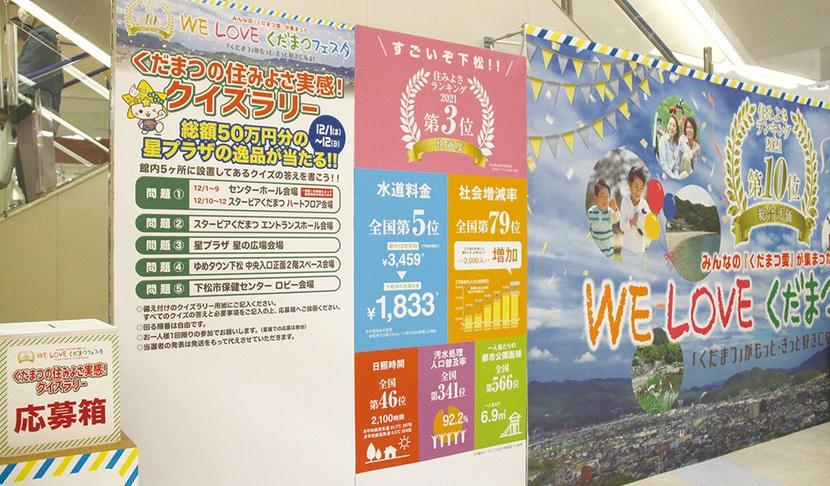 全問回答した応募用紙は、ゆめタウン1階海の広場にある応募箱に入れる。ここにも下松市の住みよさを解説するコーナーがあり、ボランティアでお客さんにデータの説明をしている市議の阿武一治さん(72)は「高校生など若い人の関心が高いのが素晴らしい。市外からの人も多い」と話していた。